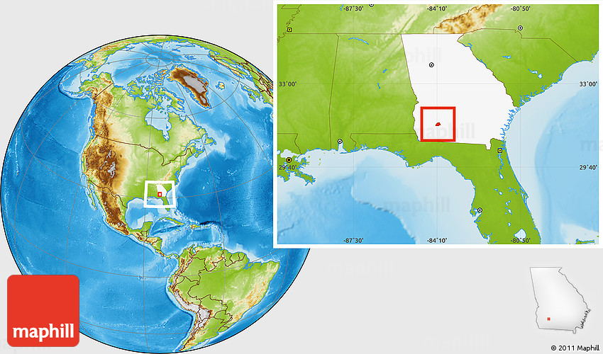Maphill is a collection of map images. This image combines a physical map with the globe centered on ZIP code 31716. Use the buttons under the image to switch to different map types.