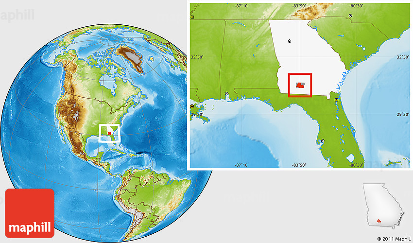 Maphill is a collection of map images. This image combines a physical map with the globe centered on ZIP code 31768. Use the buttons under the image to switch to different map types.