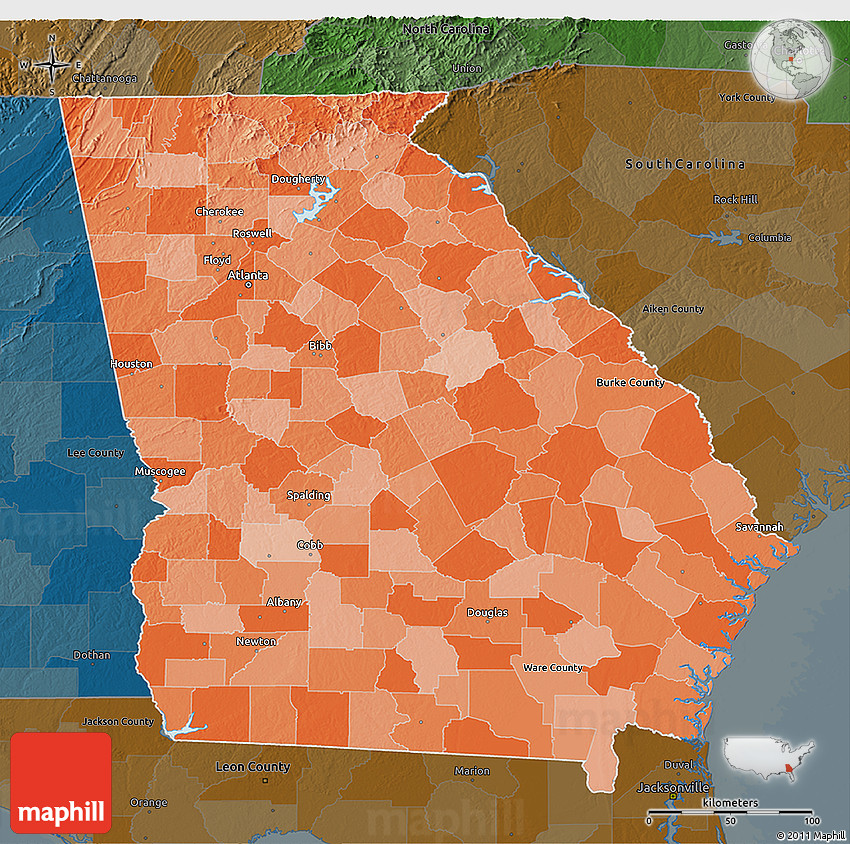 Each map type offers different information and each map style is designed for a different purpose. Read about the styles and map projection used in the above map (Political Shades 3D Map of Georgia, darken).