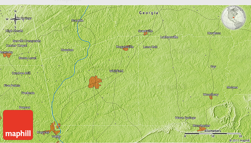 The 3D physical map represents one of many map types and styles available. Look at Houston, Heard County, Georgia, United States from different perspectives.