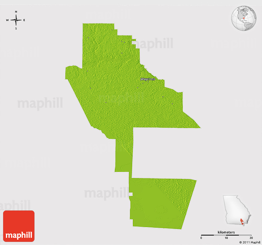 The 3D physical map represents one of several map types and styles available. Look at Ware County, Georgia, United States from different perspectives.