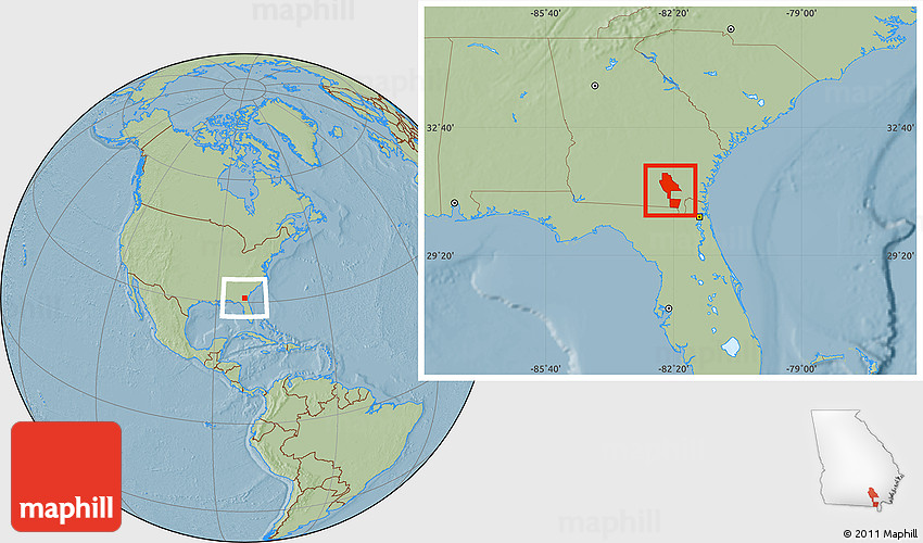 Maphill is a collection of map images. This image combines a savanna style map with the globe centered on Ware County. Use the buttons under the image to switch to different map types.