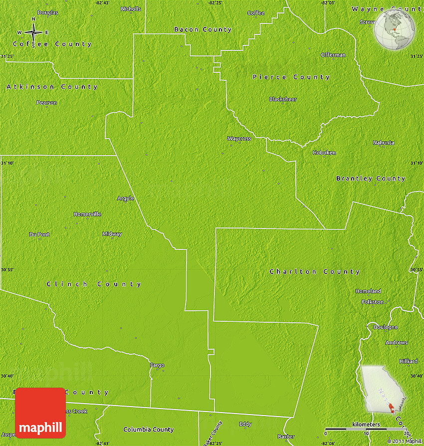 Maphill is a collection of map images. This physical map of Ware County is one of them. Click on the Detailed button under the image to switch to a more detailed map.