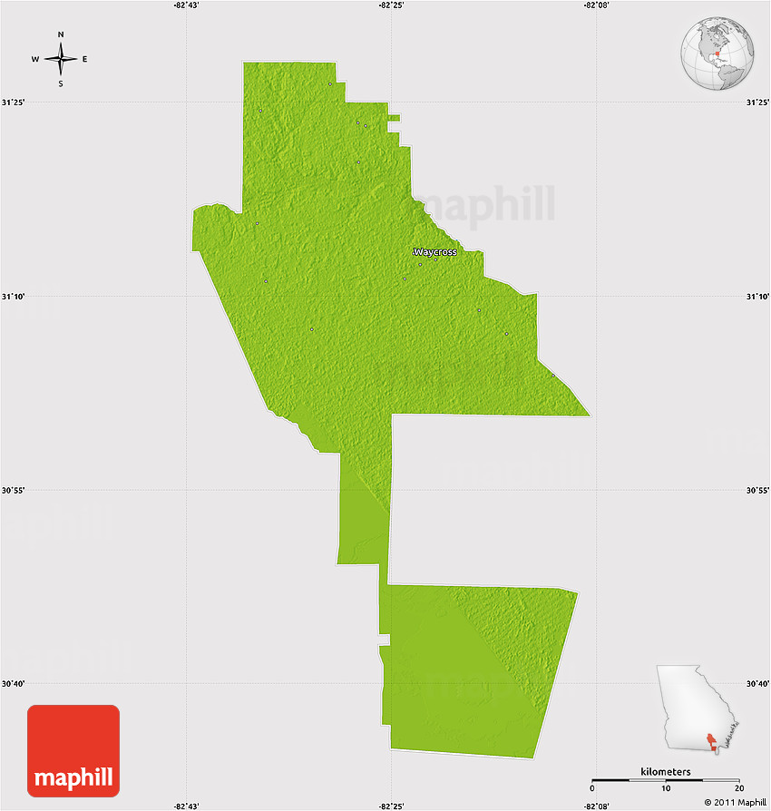 Maphill is a collection of map images. This physical map of Ware County is one of them. Click on the Detailed button under the image to switch to a more detailed map.