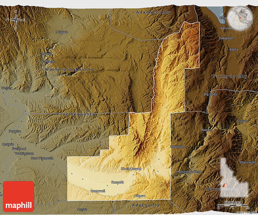 Physical map illustrates the mountains, lowlands, oceans, lakes and rivers and other physical landscape features of Gem County. Differences in land elevations relative to the sea level are represented by color.