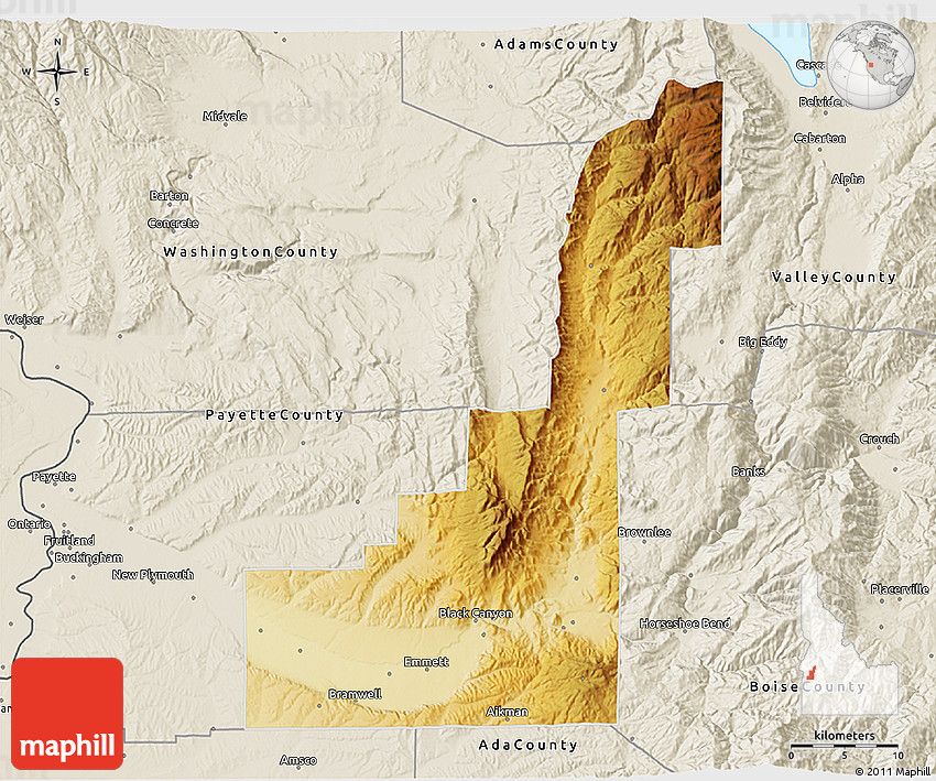 Physical map illustrates the mountains, lowlands, oceans, lakes and rivers and other physical landscape features of Gem County. Differences in land elevations relative to the sea level are represented by color.