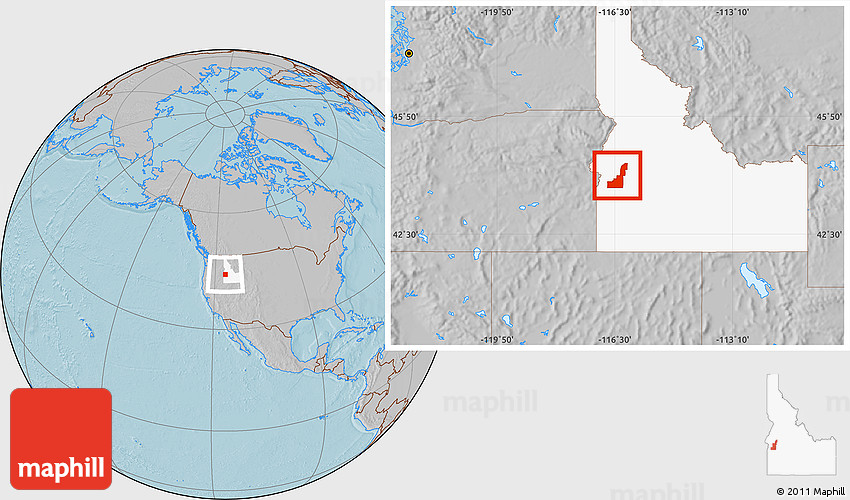 Maphill is a collection of map images. This image combines a gray map with the globe centered on Gem County. Use the buttons under the image to switch to different map types.
