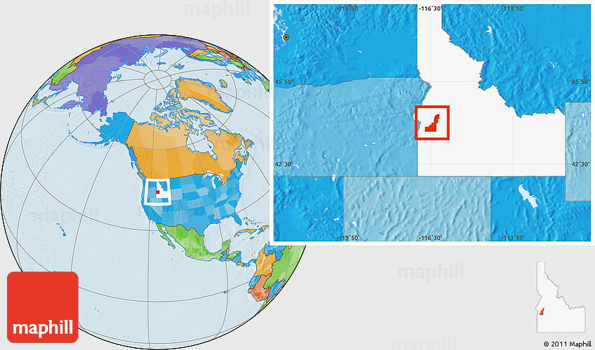 Maphill is a collection of map images. This image combines a political map with the globe centered on Gem County. Use the buttons under the image to switch to different map types.