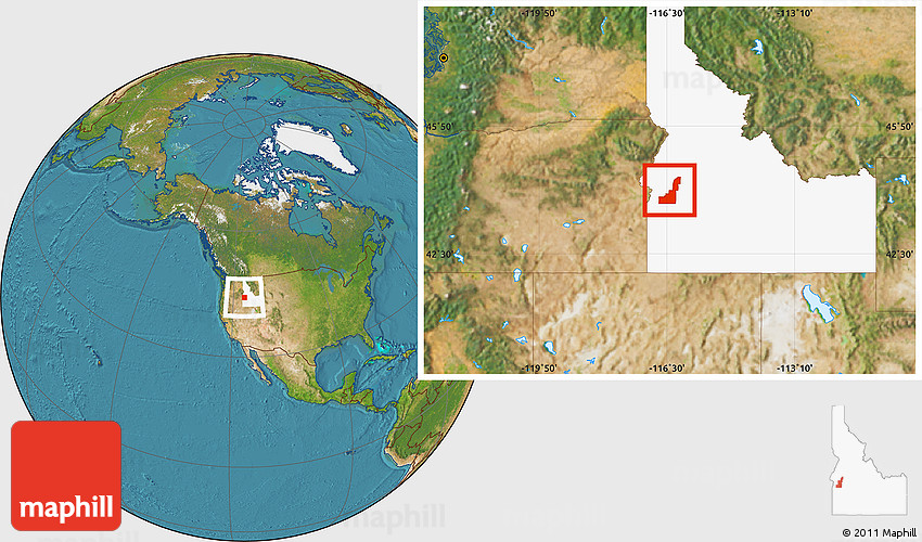 Maphill is a collection of map images. This image combines a satellite map with the globe centered on Gem County. Use the buttons under the image to switch to different map types.