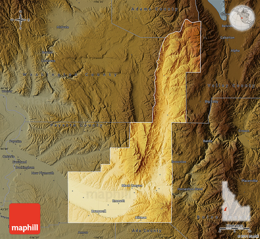 Maphill is a collection of map images. This physical map of Gem County is one of them. Click on the Detailed button under the image to switch to a more detailed map.