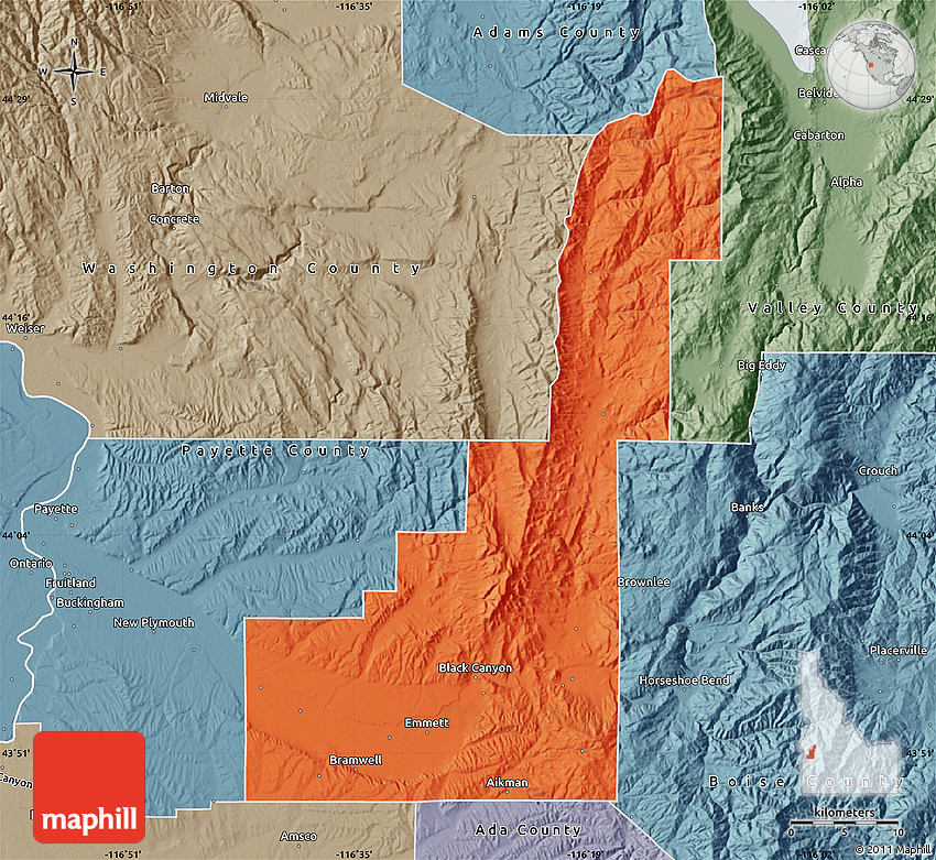 Maphill is a collection of map images. This political map of Gem County is one of them. Click on the Detailed button under the image to switch to a more detailed map.