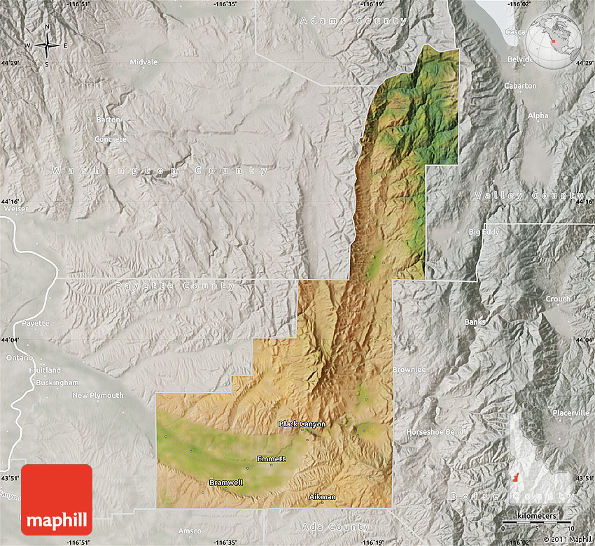 Maphill is a collection of map images. This satellite map of Gem County is one of them. Click on the Detailed button under the image to switch to a more detailed map.
