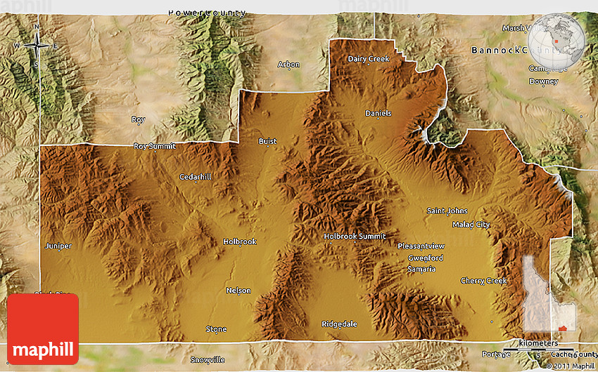 The 3D physical map represents one of several map types and styles available. Look at Oneida County, Idaho, United States from different perspectives.