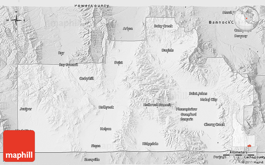 The 3D silver style map represents one of several map types and styles available. Look at Oneida County, Idaho, United States from different perspectives.