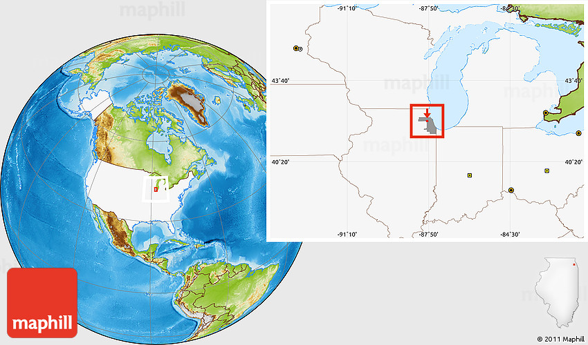 Maphill is a collection of map images. This image combines a physical map with the globe centered on ZIP code 60018. Use the buttons under the image to switch to different map types.