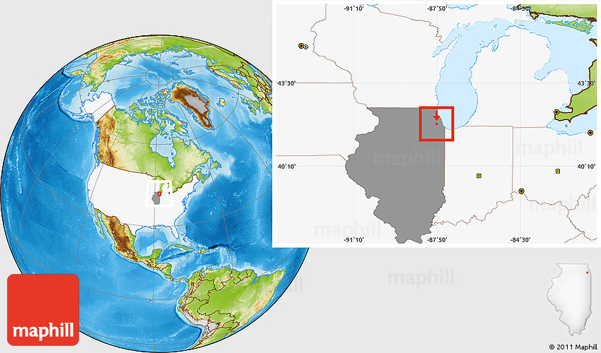 Maphill is a collection of map images. This image combines a physical map with the globe centered on ZIP code 60155. Use the buttons under the image to switch to different map types.