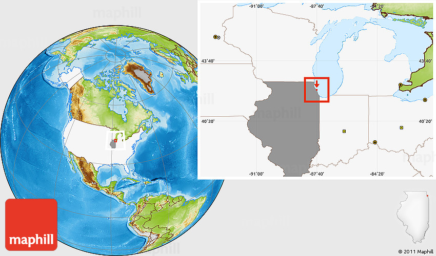 Maphill is a collection of map images. This image combines a physical map with the globe centered on ZIP code 60208. Use the buttons under the image to switch to different map types.
