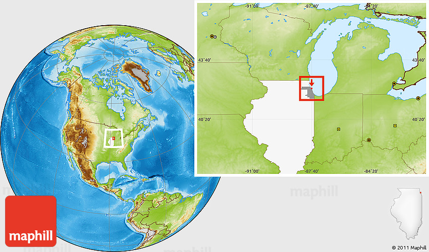 Maphill is a collection of map images. This image combines a physical map with the globe centered on ZIP code 60208. Use the buttons under the image to switch to different map types.