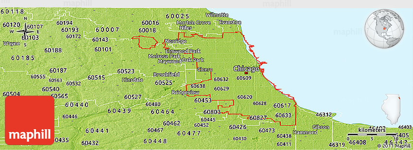 The panoramic physical map represents one of several map types and styles available. Look at ZIP codes starting with 606 from different perspectives.