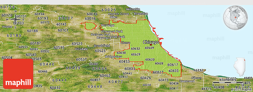The panoramic physical map represents one of several map types and styles available. Look at ZIP codes starting with 606 from different perspectives.