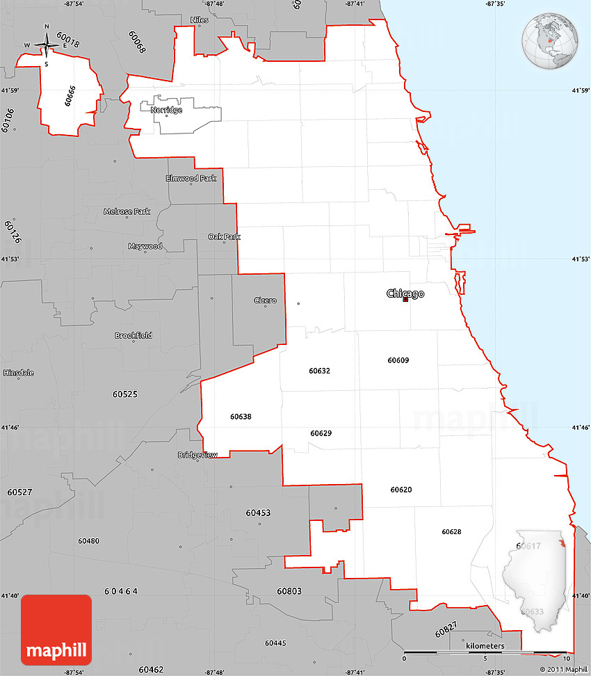 The simple gray map represents one of several map types and styles available. Look at ZIP codes starting with 606 from different perspectives.
