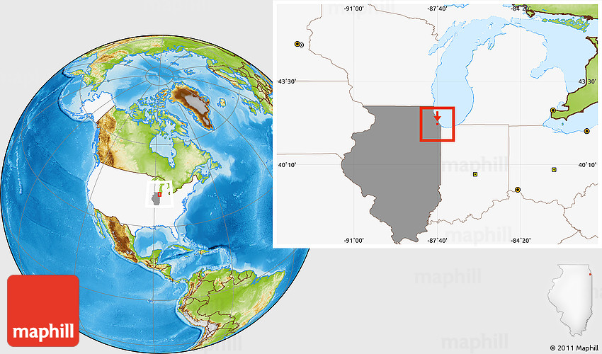 Maphill is a collection of map images. This image combines a physical map with the globe centered on ZIP code 60636. Use the buttons under the image to switch to different map types.