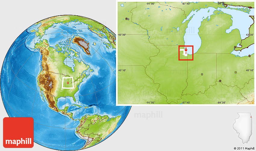 Maphill is a collection of map images. This image combines a physical map with the globe centered on ZIP code 60636. Use the buttons under the image to switch to different map types.