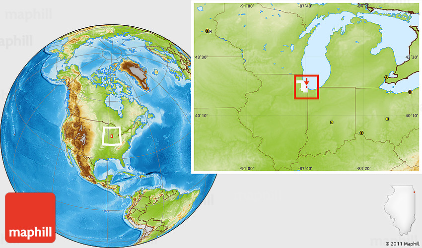 Maphill is a collection of map images. This image combines a physical map with the globe centered on ZIP code 60637. Use the buttons under the image to switch to different map types.