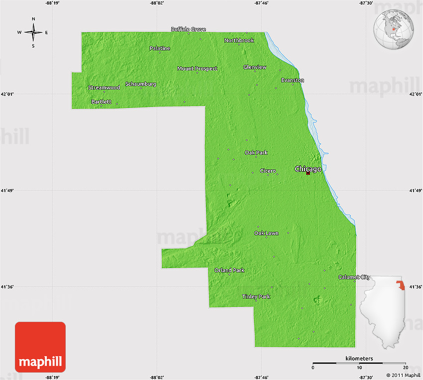 The flat political map represents one of several map types and styles available. Look at Cook County, Illinois, United States from different perspectives.