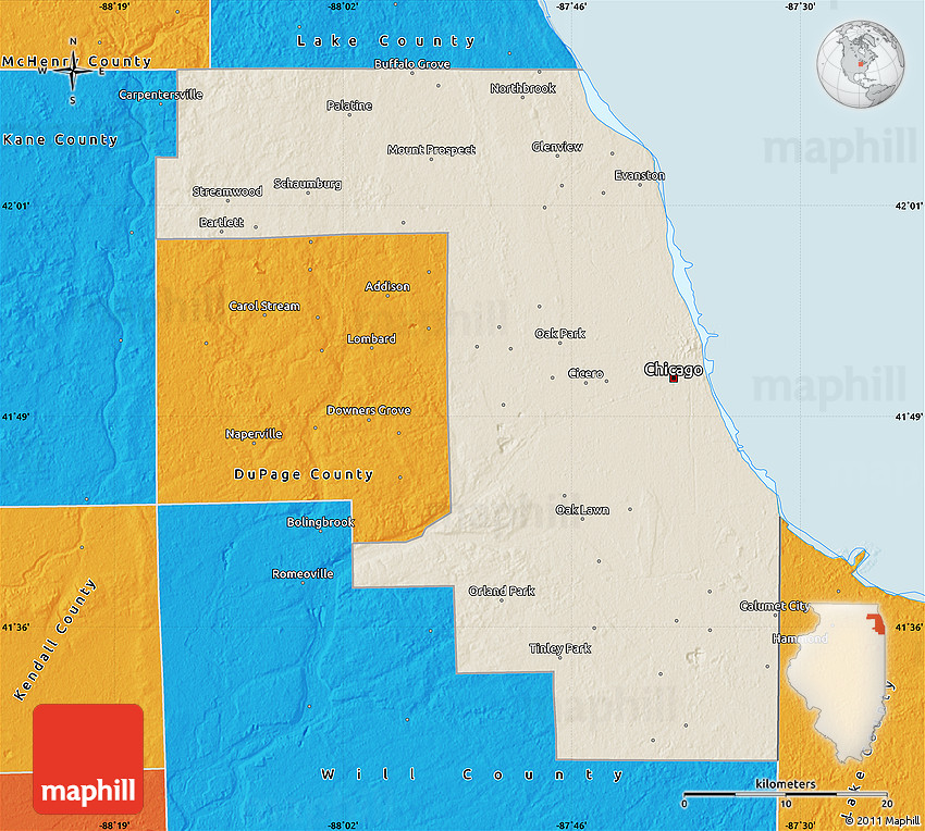 The flat shaded relief map represents one of several map types and styles available. Look at Cook County, Illinois, United States from different perspectives.