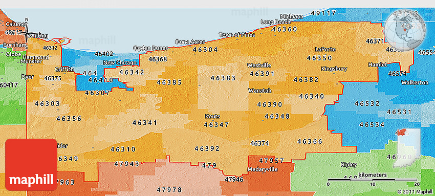 The panoramic political shades map represents one of several map types and styles available. Look at ZIP codes starting with 463 from different perspectives.