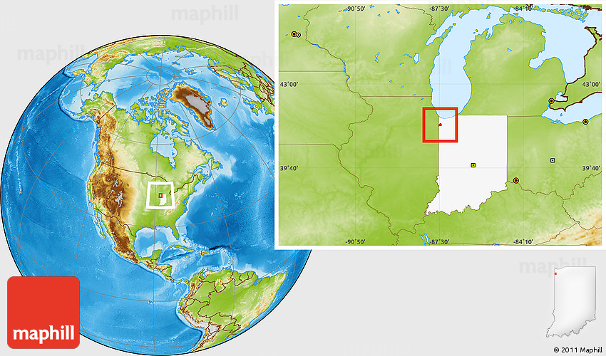 Maphill is a collection of map images. This image combines a physical map with the globe centered on ZIP code 46303. Use the buttons under the image to switch to different map types.