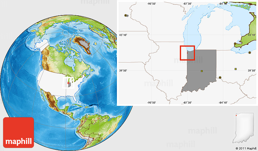 Maphill is a collection of map images. This image combines a physical map with the globe centered on ZIP code 46311. Use the buttons under the image to switch to different map types.