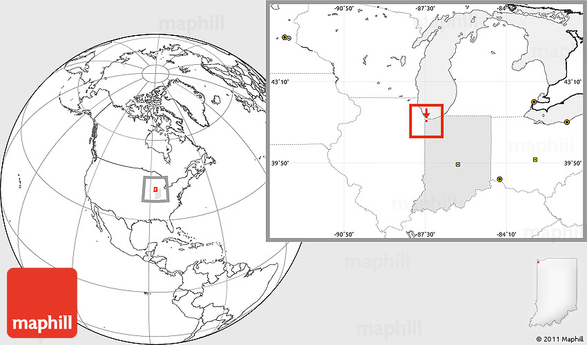 Maphill is a collection of map images. This image combines a blank map with the globe centered on ZIP code 46322. Use the buttons under the image to switch to different map types.