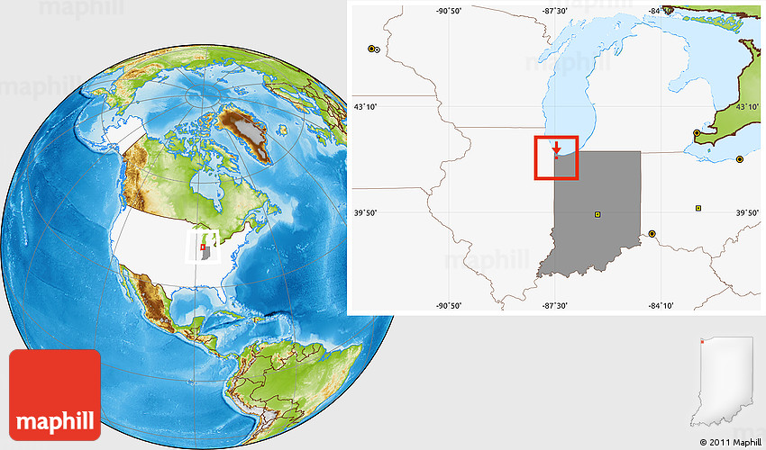 Maphill is a collection of map images. This image combines a physical map with the globe centered on ZIP code 46322. Use the buttons under the image to switch to different map types.