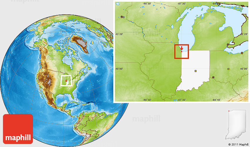 Maphill is a collection of map images. This image combines a physical map with the globe centered on ZIP code 46327. Use the buttons under the image to switch to different map types.