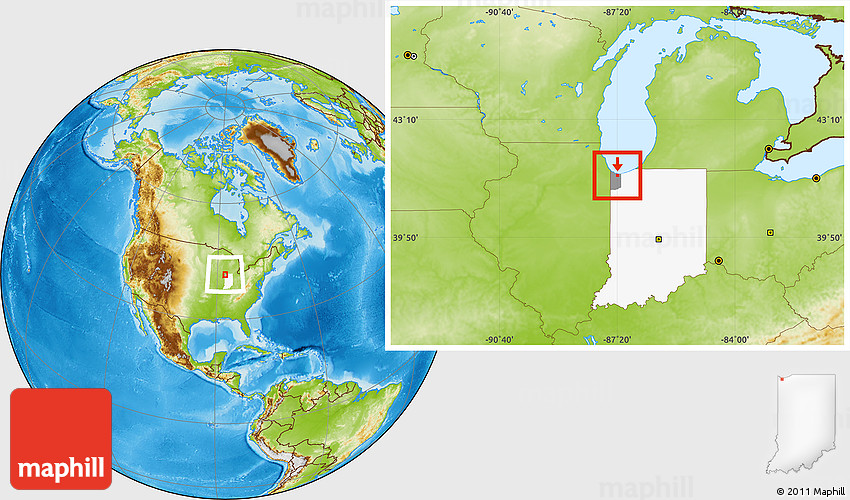 Maphill is a collection of map images. This image combines a physical map with the globe centered on ZIP code 46407. Use the buttons under the image to switch to different map types.