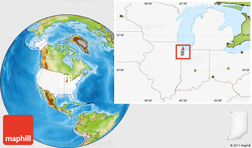 Maphill is a collection of map images. This image combines a physical map with the globe centered on ZIP code 46409. Use the buttons under the image to switch to different map types.
