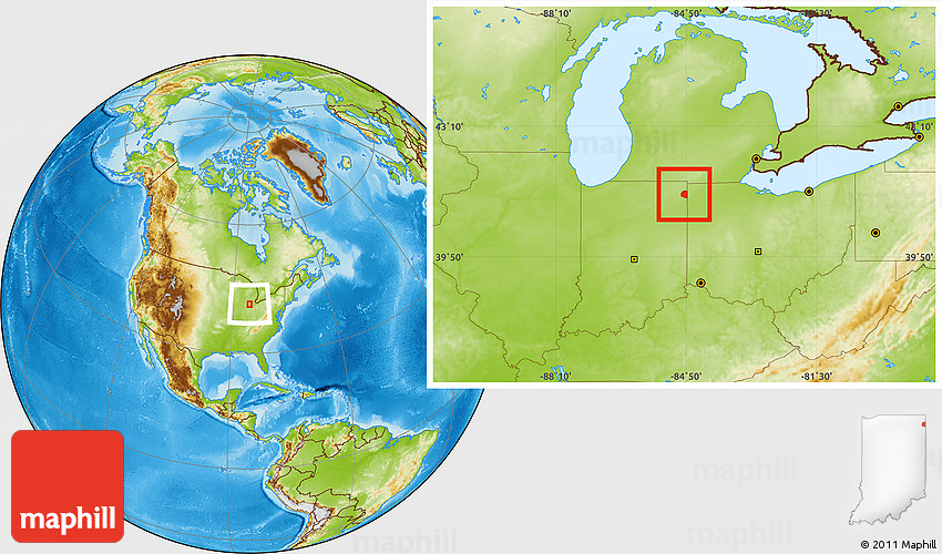 Maphill is a collection of map images. This image combines a physical map with the globe centered on ZIP code 46721. Use the buttons under the image to switch to different map types.