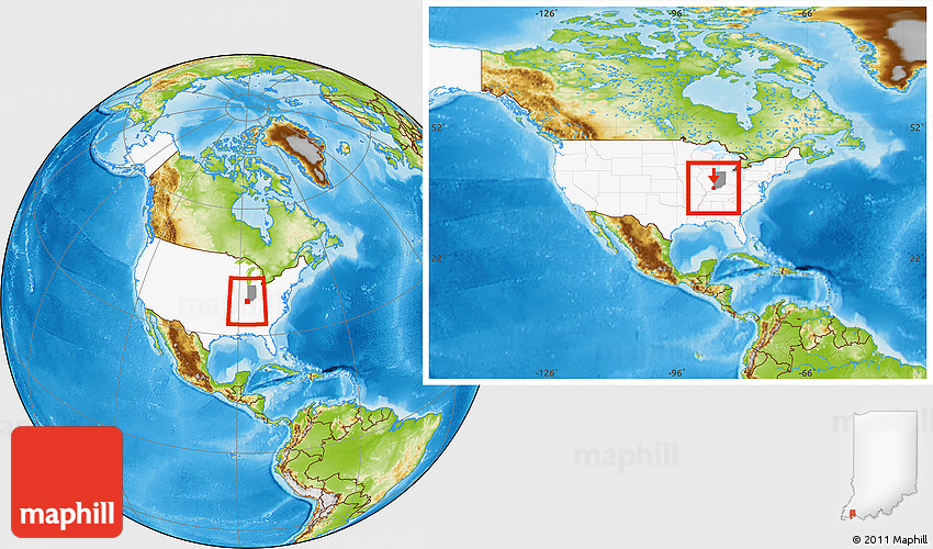 Maphill is a collection of map images. This image combines a physical map with the globe centered on Vanderburgh County. Use the buttons under the image to switch to different map types.