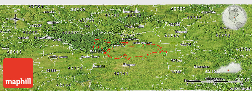 Sure, this satellite panoramic map is nice. But there is good chance you will like some other style of the 42127 ZIP code maps even more. Select another style in the above table. Or use the buttons under the map to change the map view.