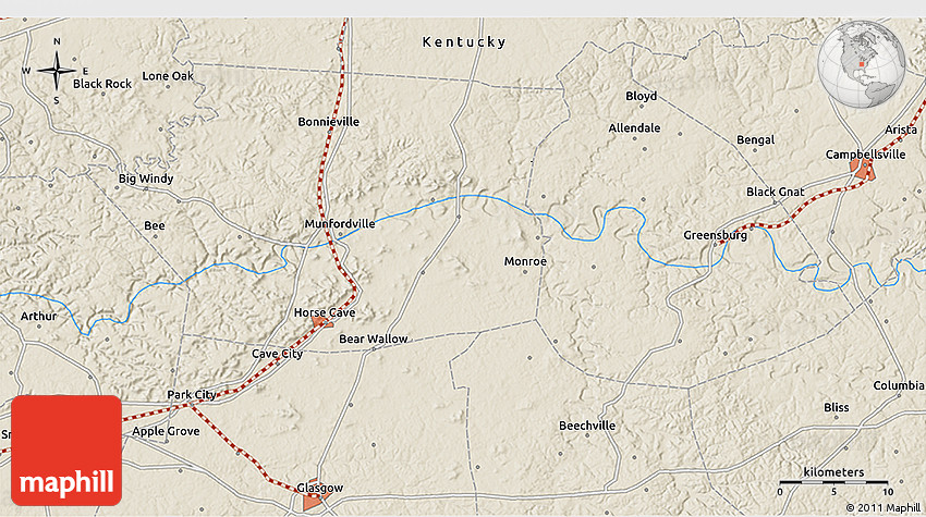 The 3D shaded relief map represents one of many map types and styles available. Look at Halfway, Barren County, Kentucky, United States from different perspectives.