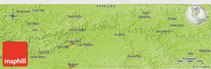 The panoramic physical map represents one of many map types and styles available. Look at Oil City, Barren County, Kentucky, United States from different perspectives.