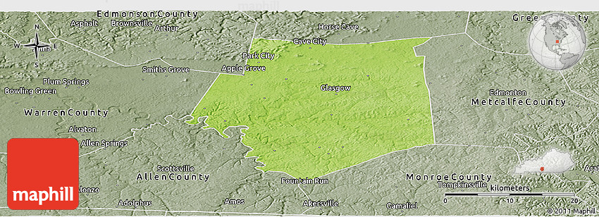 The panoramic physical map represents one of several map types and styles available. Look at Barren County, Kentucky, United States from different perspectives.