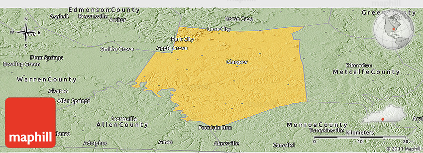 The panoramic savanna style map represents one of several map types and styles available. Look at Barren County, Kentucky, United States from different perspectives.
