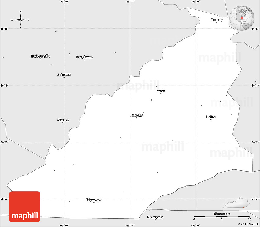 The simple silver style outline map represents one of several map types and styles available. Look at Bell County, Kentucky, United States from different perspectives.