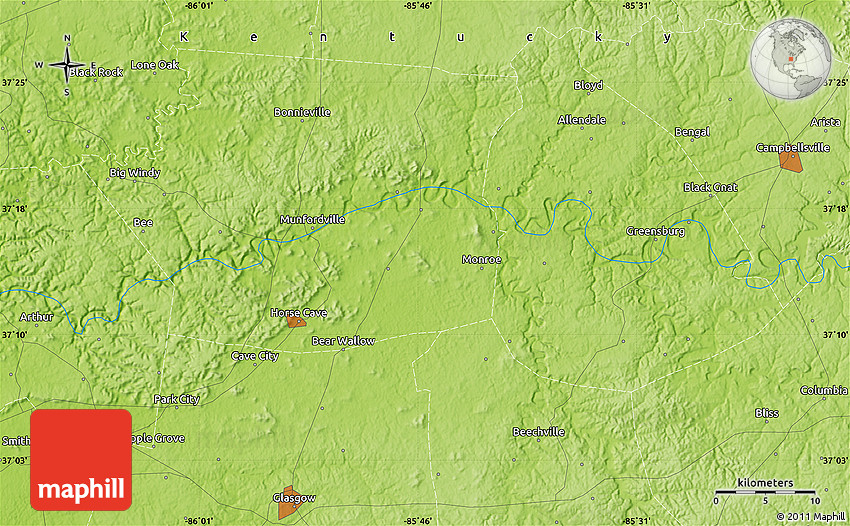 The flat physical map represents one of many map types available. Look at Bear Wallow, Hart County, Kentucky, United States from different perspectives.