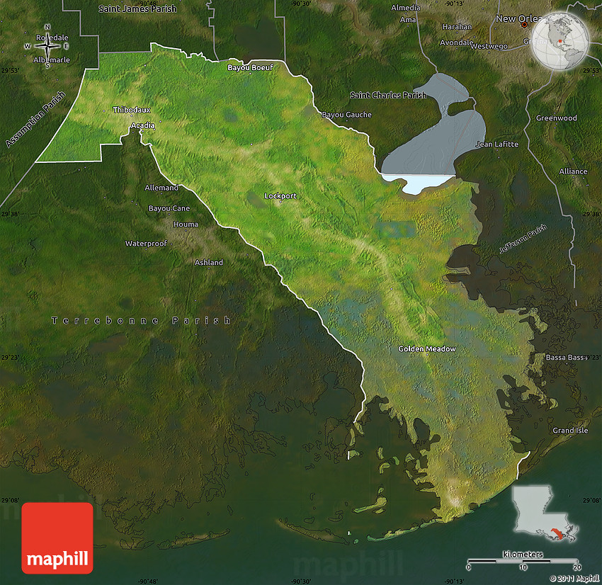 Each map type offers different information and each map style is designed for a different purpose. Read about the styles and map projection used in the above map (Satellite Map of Lafourche Parish, darken).