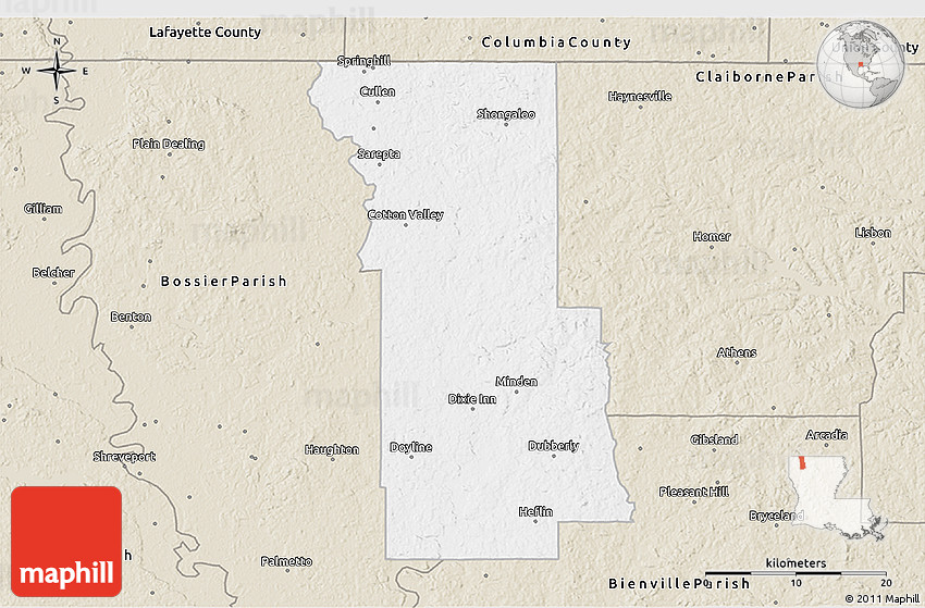 This map uses colors of vintage antique maps. Webster Parish is highlighted with white. The rest of the map is beige colored shaded relief map.