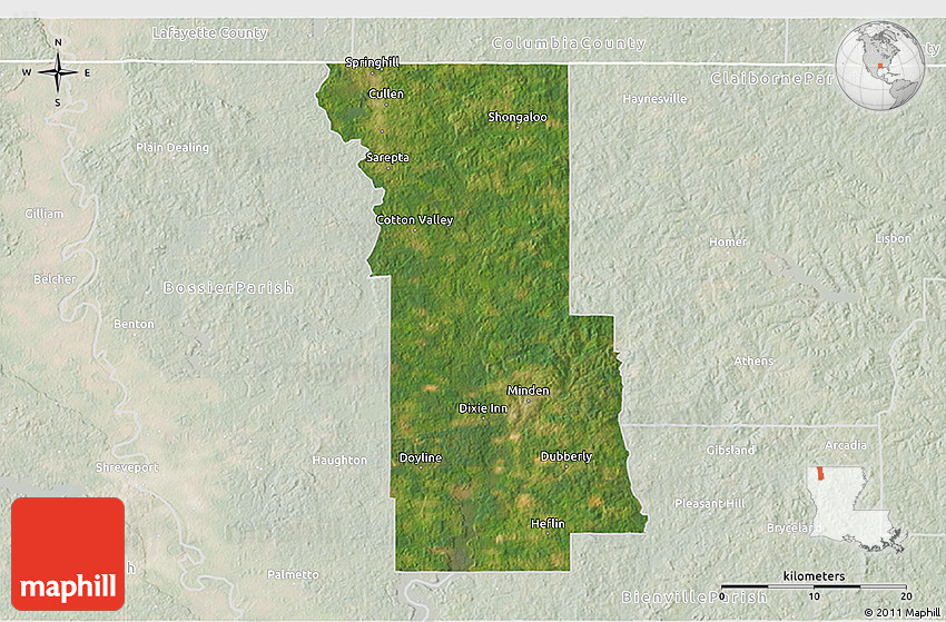 Satellite map shows the Earth's surface as it really looks like. The above map is based on satellite images taken on July 2004. This satellite map of Webster Parish is meant for illustration purposes only. For more detailed maps based on newer satellite and aerial images switch to a detailed map view.